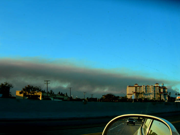 この乾いた強い風による山火事のニュースは、ドライブ中に流れるFMからひっきりなしに放送。LA側の空を見ると、燃えた煙で重い色の雲が広がってた。