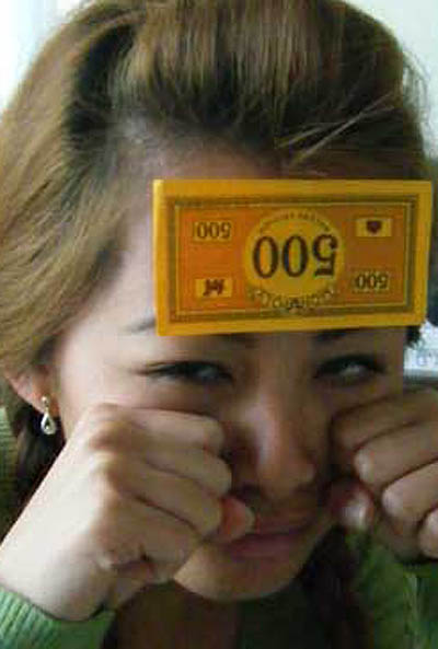 おでこに大金を貼り付け、嘘泣きで「金くれ~」という子。