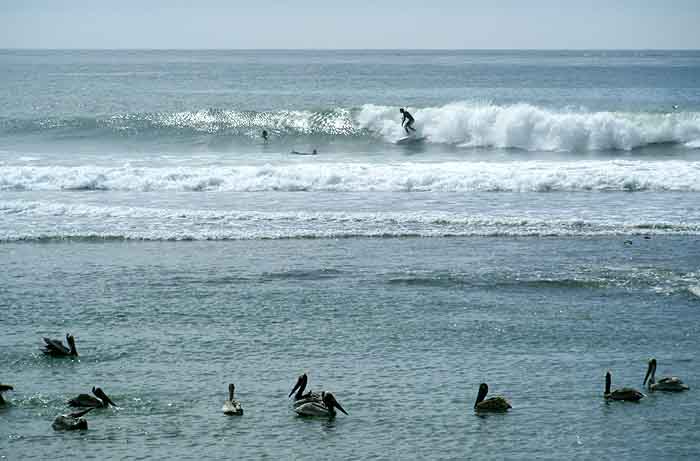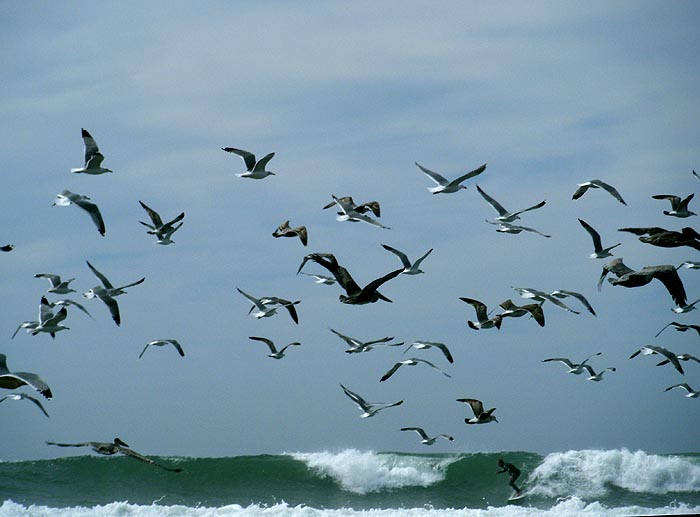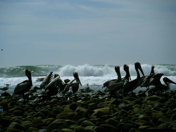 ペリカンと波。羽をバタバタさせ、まるでお風呂で体を洗っているみたいでした。