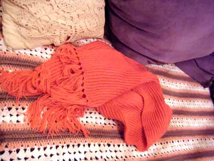 秋口から編み始めた、ブーゲンビリア色の超ロングマフラーがやっと完成。