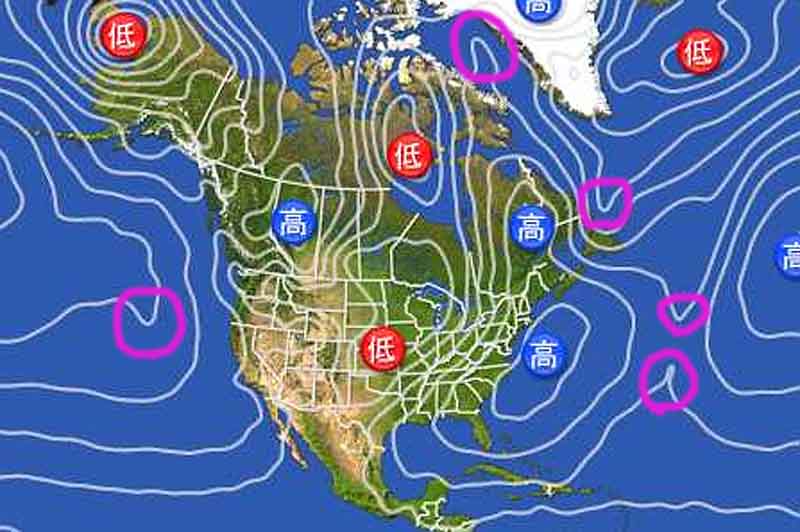 ピンク色で丸をした部分、等圧線が尖り気味。このような場所を気圧の谷といい、そこには低気圧にはなりきれない程度の雲があり、反時計回りで風が吹きます。