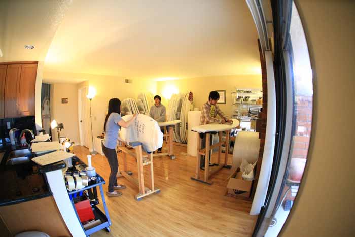 サーフボードが届いた途端、スタートする検品。本日の検品隊は、ヒロカズくん、コウヘイくん、そして自分の3人でした。フォーメーションは、トライアングルでっ♪
