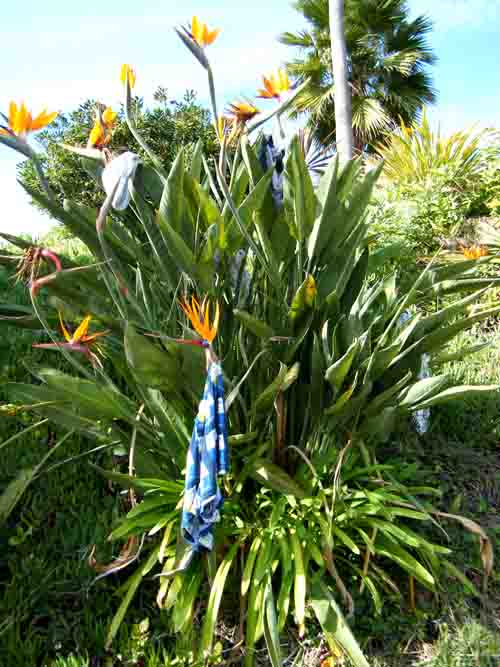 駐車していた脇に咲いていた極楽花。そこにたくさんのトランクス?っていうか男物の下着、日本語で言うパンツがたくさんかけてある; ̄ロ ̄)!!