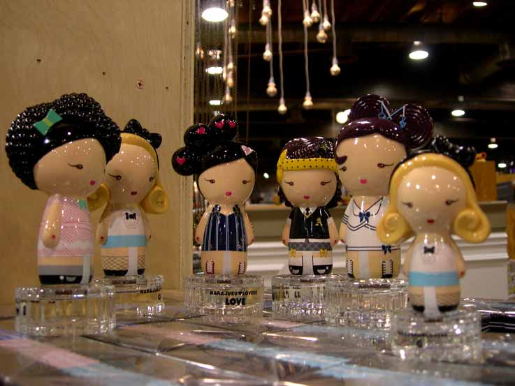 彼女たちは頭がフタ。「HARAJUKU lovers」の香水なのだ。旬で個性的な香り。少し甘酸っぱいようなフラワー・フルーティーMIXに反応してしまうので、右から3番目の子、音楽ちゃんを買うか迷った。でも買わなかった。お値段は$50・・オモチャみたいなのに。