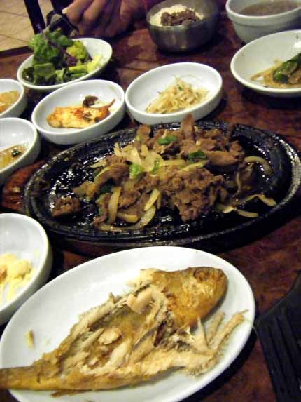 オーダーしたのは。3人でカルビ、シーフードスンデュブ、冷麺の3つ。周りのお小皿は、全て前菜的に勝手に出てきます。中でも、手前に写っている白身魚が絶品♪これがおかわり自由なんて!←既に食べ進んでから、写真を撮っていないことに、あやちゃんの一言で気づきました(ーー;)