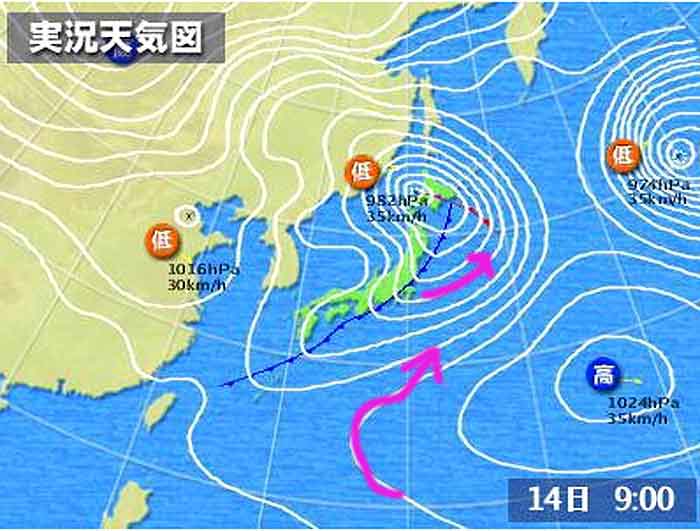 今回はなぜ西寄りのウネリが強まったのか?それは天気図にピンク色で記した空気の流れで一目瞭然ですね!