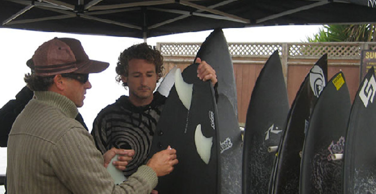 とあるイヴェントでトム・カレンに板の説明をするAVISO王子ニック。