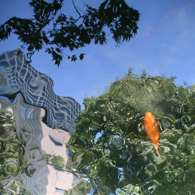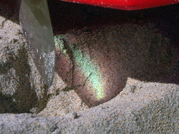強い日差しに透けてオーロラ色の影をつくっていたスケッグ。